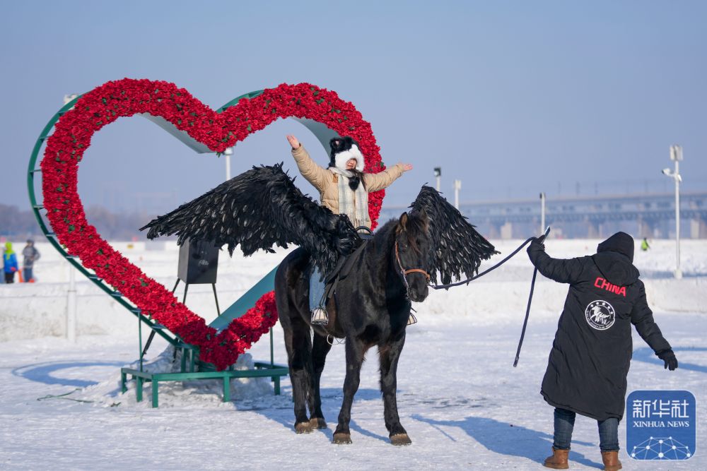 ↑ 1月11日,游客在松花江哈尔滨段江面上骑马留影。新华社记者 王建威 摄
