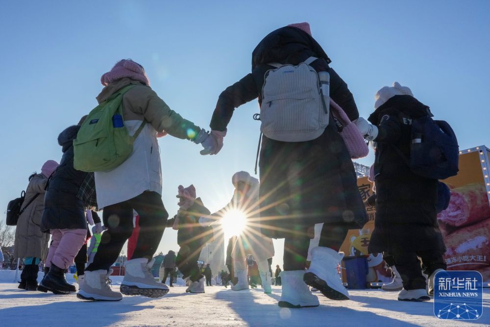 ↑ 1月10日,游客在松花江哈尔滨段江面上玩耍。新华社记者 王建威 摄
