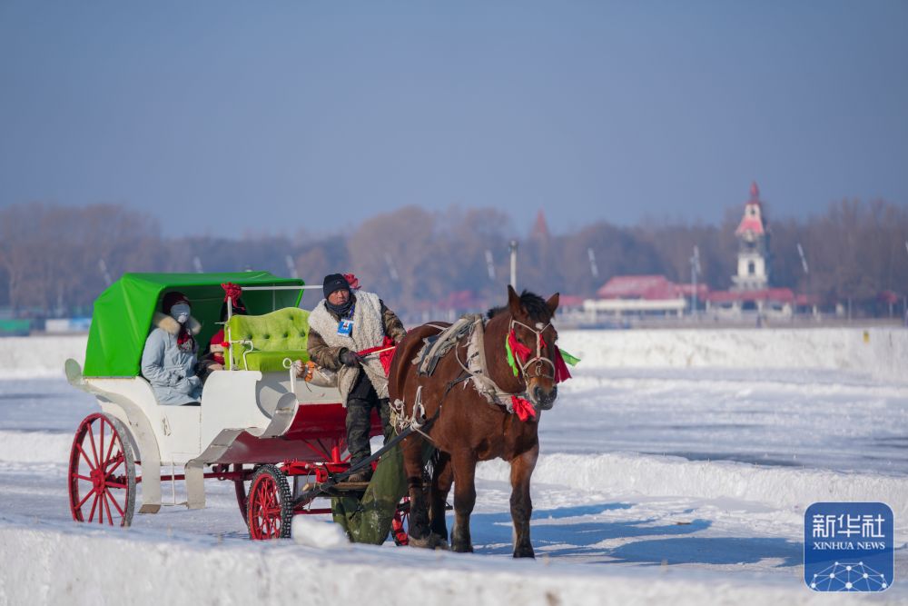 ↑ 1月11日,游客在松花江哈尔滨段江面上乘坐马车。新华社记者 王建威 摄