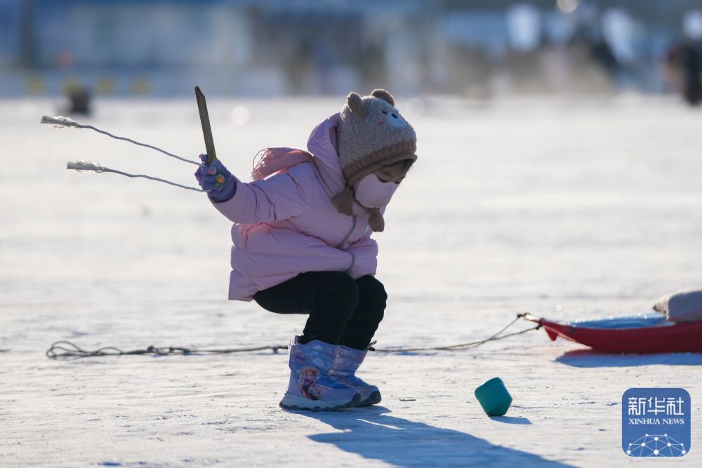 ↑ 1月10日,小朋友在松花江哈尔滨段江面上抽冰尜。新华社记者 王建威 摄