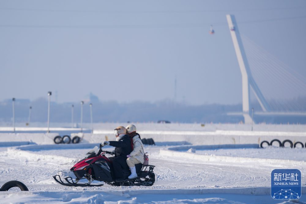 ↑ 1月11日,游客在松花江哈尔滨段江面体验雪地摩托。新华社记者 王建威 摄