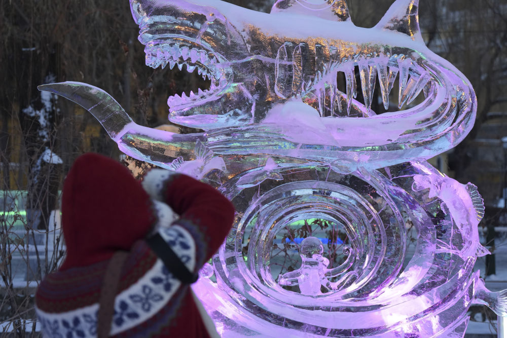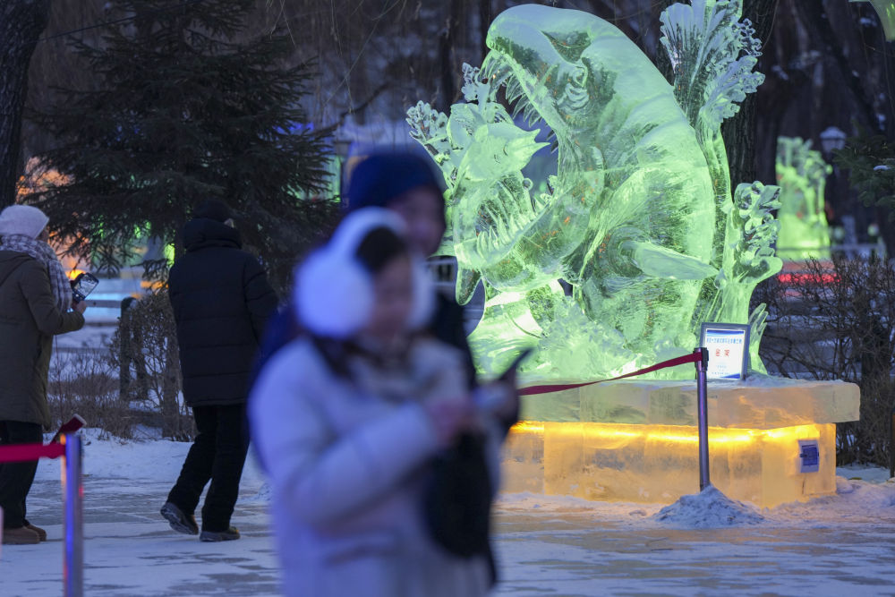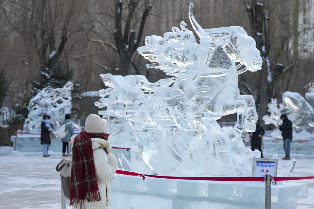 这是在哈尔滨市兆麟公园举办的第52届哈尔滨冰灯艺术游园会上展出的冰雕作品(1月14日摄)。