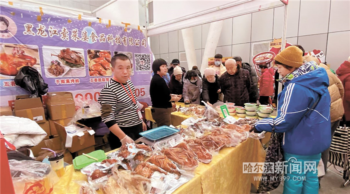 不远处,辽宁葫芦岛企业佐香园摆开了“流水席”。近10个锅灶现场制作酸菜炖白肉、香辣羊蝎子,咕嘟冒泡的炖菜香气弥漫开来,吸引人群不断聚集。