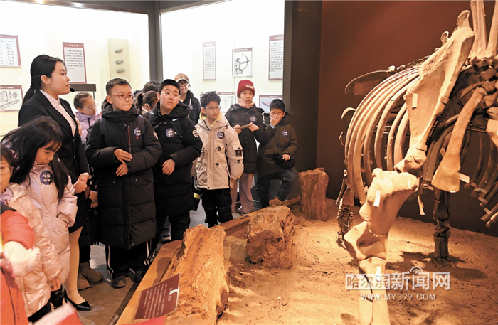 博物馆展厅内猛犸象、披毛犀等巨兽化石骨架巍然矗立,瞬间抓住了孩子们的目光,孩子们通过讲解员生动的讲述以及体验触摸等互动展项,不仅“看”到了历史,更“摸”到了时间的痕迹。孩子们在民族文化展区观看到古代先民的农耕器具,认识了鄂伦春族的桦树皮船、赫哲族的鱼皮服饰,纷纷打卡留念,记录下这段难忘的时光。