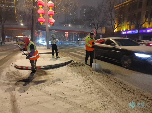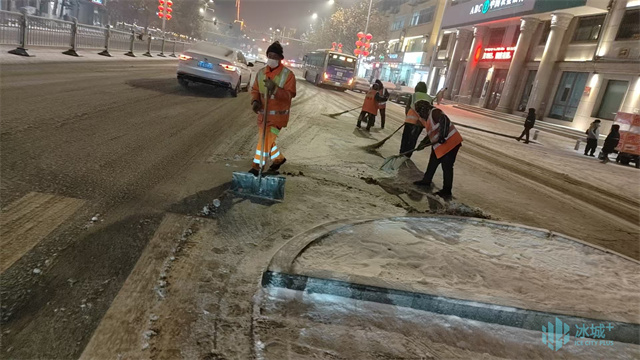 在珠江路作业现场,机械完成主干道推雪后,环卫工人随即对人行道、公交站台等区域进行人工清理。寒风中,他们手中的铁锹和扫帚持续作业,部分人员的手套已被雪水浸湿。