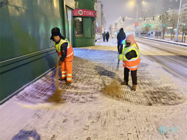 当晚20时许,香坊区中山路、红旗大街、三大动力路等主干街路上,大型清雪设备编组作业,滚刷清扫、铲雪跟进,配合有序。在车灯与路灯映照下,环卫工人分布在道路两侧及人行步道板上,清理机械作业后的残留积雪。