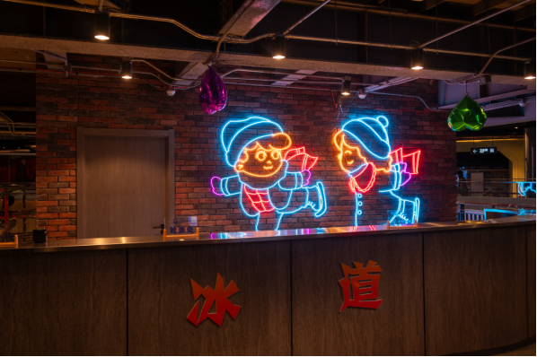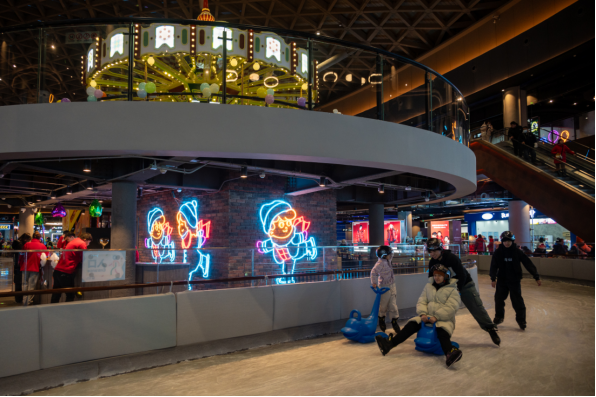 小朋友和大朋友们穿戴着免费提供的滑冰鞋和头盔,在冰滑道上欢乐滑行,做快乐的冰上精灵。滑道项目还为游客免费提供滑冰助手,即便是零基础的滑冰新手也能畅玩。