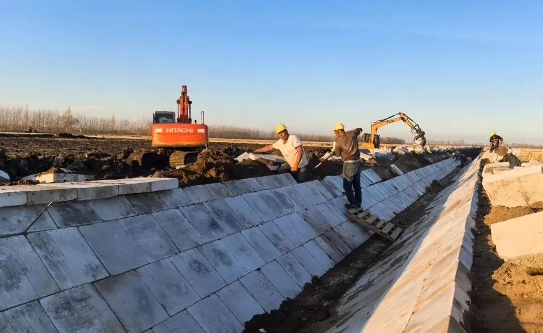 初冬时节,在兴凯湖农场增发国债高标准农田建设项目田间排水沟道清淤、衬砌施工现场,一台台大型挖掘机伸着粗壮的机械臂不断从沟渠中挖出一斗斗淤泥,工人们在纵横交错的水利设施间忙着铺砌砖石、加固渠道,一派热火朝天的忙碌景象。
