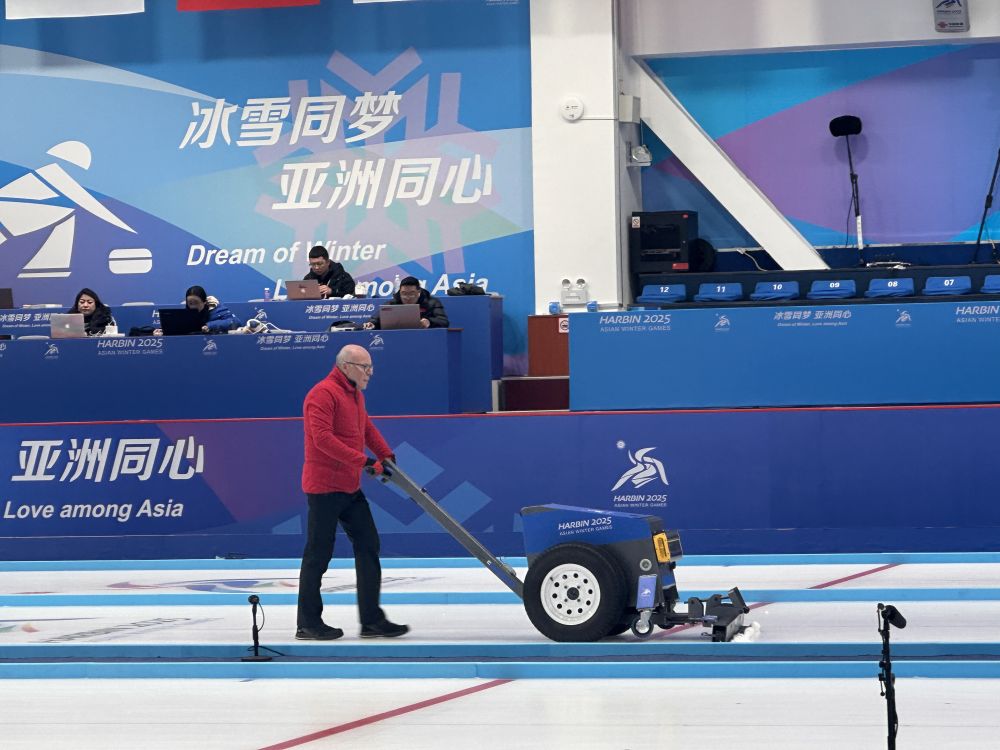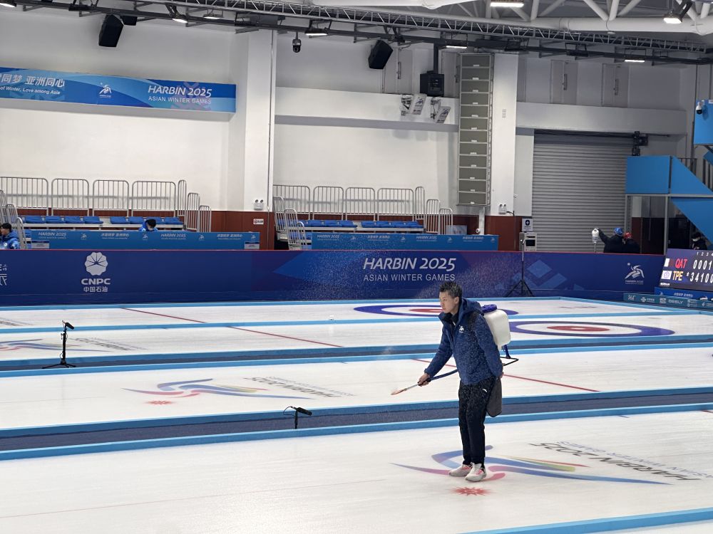 在哈尔滨亚冬会冰壶赛场上,每场比赛开始前,都能看到一位制冰师推着修冰车,在冰道上来回行走,修理冰面。清理冰屑后,制冰师背着水箱,手握喷头,脚步均匀在冰面上一边倒退,一边“打点”,让冰面恢复到最佳状态。比赛开始后,制冰师团队负责人杜伟拿着秒表,不时在赛场边关注冰面情况。