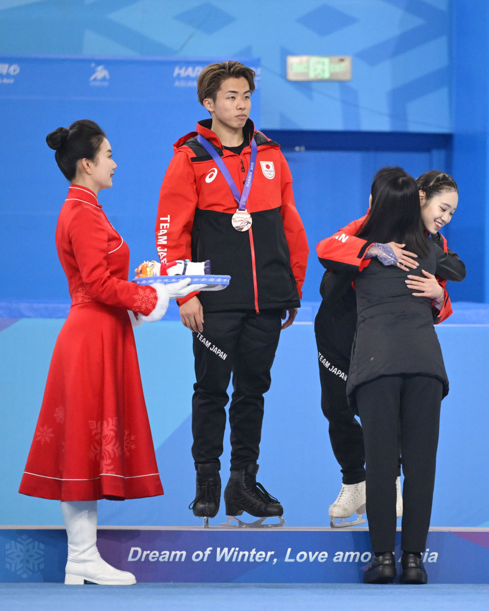 ↑中国花样滑冰协会副主席申雪(右二)为日本组合长冈柚奈(右一)/森口澄士(左二)颁奖。新华社记者 颜麟蕴 摄