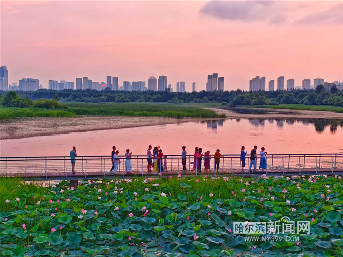 市民游客欣赏荷塘美景。“哈报手机记者”许朝宁摄