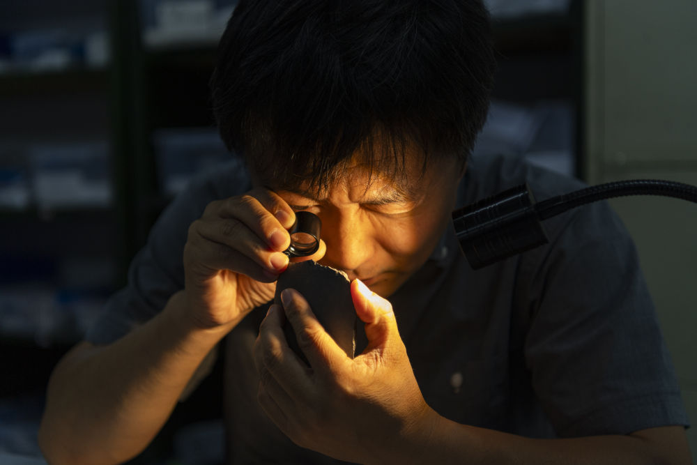 8月27日,在哈尔滨市,黑龙江省文物考古研究所副所长、小南山考古发掘项目负责人李有骞用放大镜查看小南山遗址中出土的石器。新华社记者 谢剑飞 摄