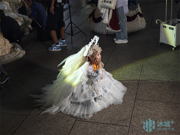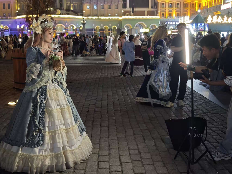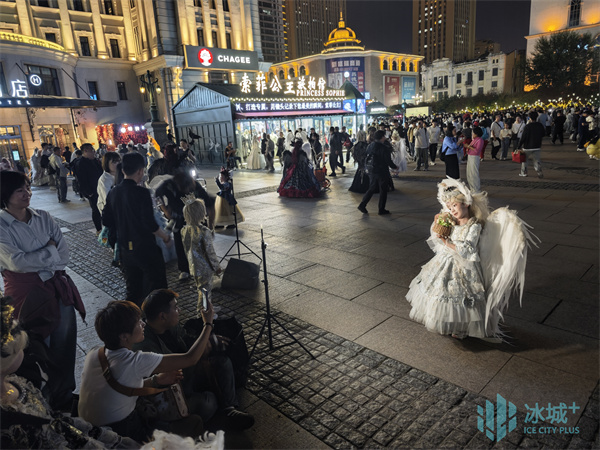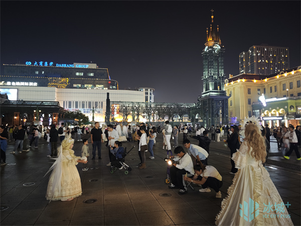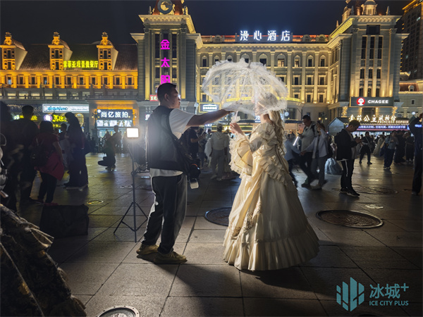 夜色渐浓,华灯次第亮起,广场每个角落都在上演不同的“童话”。来自长沙的独行女孩小霞倚着雕花石栏,亮银色长裙如流水般垂落,裙摆上的细闪与远处霓虹交相辉映,构成极具电影感的梦幻场景。“一直想完成一次属于自己的旅行,”她微笑着说,“在哈尔滨,我找到了专属于我的‘公主时刻’。”不远处,一对母女在柔和的摄影灯光中,演绎着温馨的童话。母亲的雪白纱袍与女儿的粉嫩蓬裙在夜色中形成温柔的对比。“妈妈,这里的夜晚比白天还要美!”小女孩轻声赞叹,手中的星星灯在暮色中划出明亮轨迹。