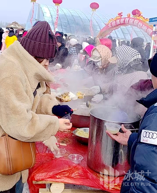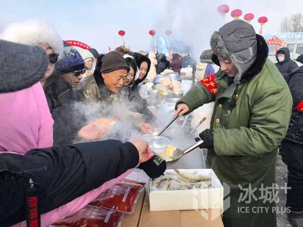 在现场冬捕火热进行的同时,免费“团圆宴”也准备就绪,市民游客和当地乡亲排起了长队,一同享受冰雪季“年嚼裹儿”。