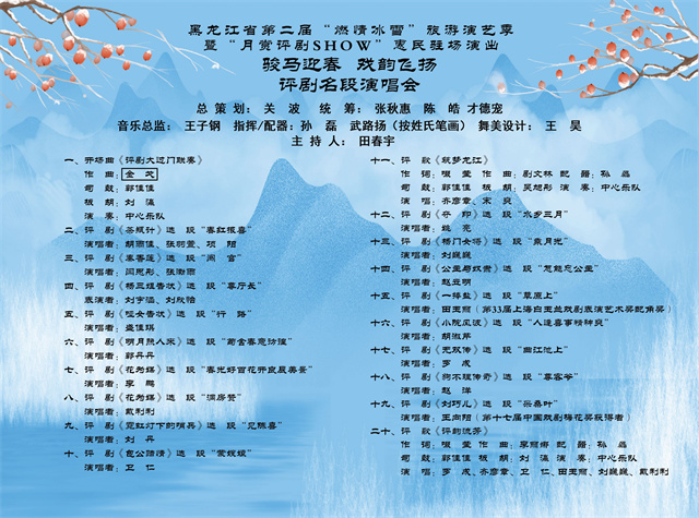 2月18日、19日(大年初二、初三),“骏马迎春、戏韵飞扬”评剧名段演唱会率先登场。中心优秀中青年骨干力量将呈现二十余个经典唱段,既有《茶瓶计》《秦香莲》《花为媒》等传统剧目韵味,也有《夺印》《霓虹灯下的哨兵》《小院风波》等现代戏回响,还有《评韵流芳》《筑梦龙江》等原创评歌。著名评剧表演艺术家新凤霞关门弟子、国家级非遗传承人、梅花奖得主王向阳将压轴献唱《刘巧儿》选段“采桑叶”,星光熠熠唱响新春。