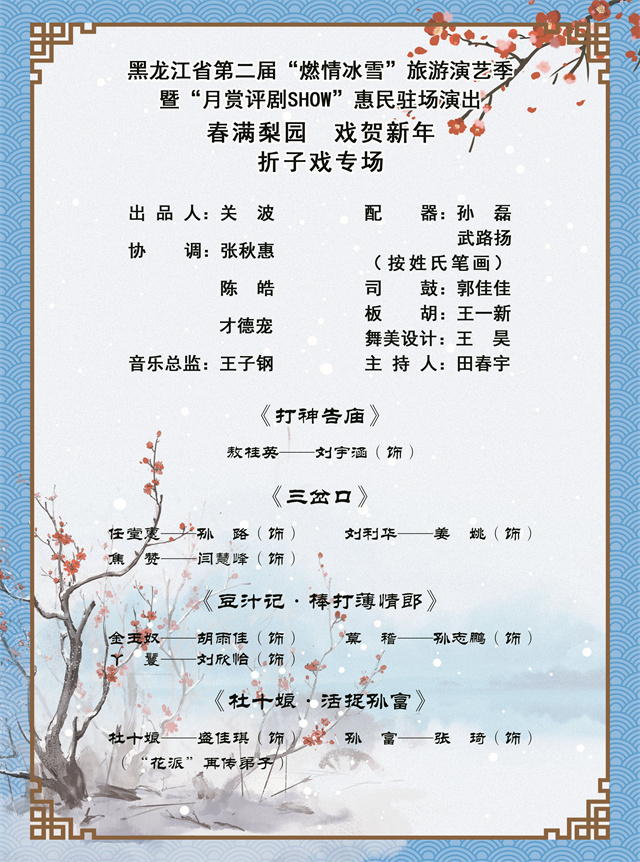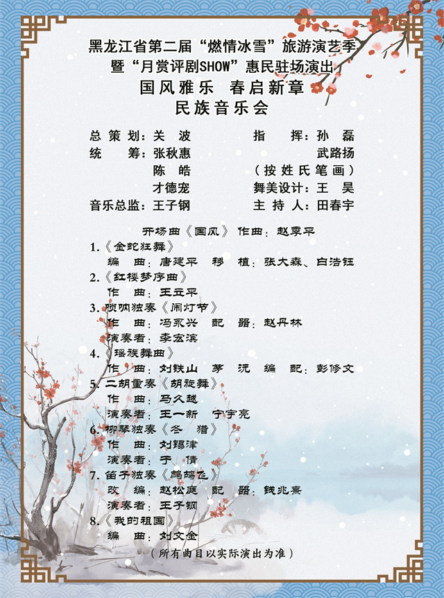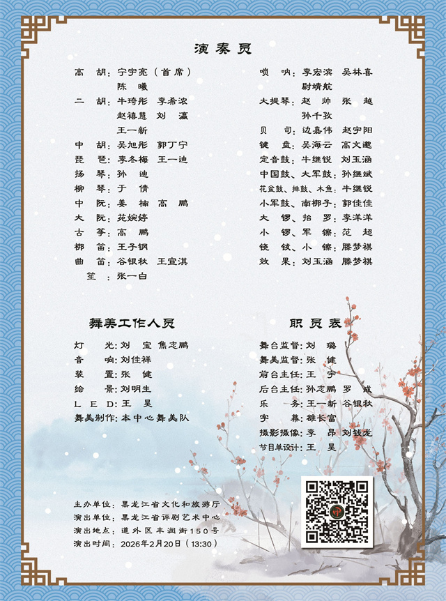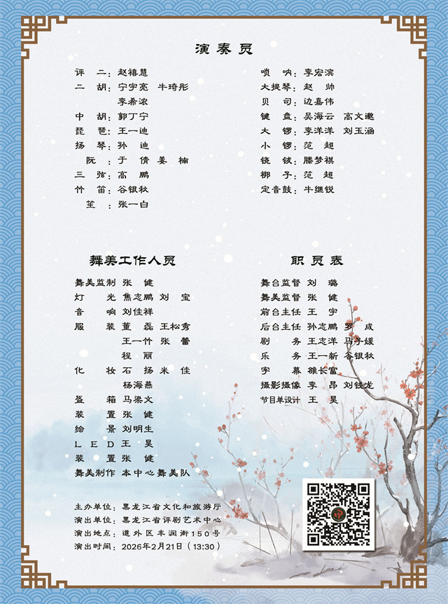 为营造喜庆祥和的新春佳节氛围,丰富群众节日精神文化生活,黑龙江省评剧艺术中心精心筹备,将于大年初二至初五在中心剧场连续推出四场“燃情冰雪”旅游演艺季暨“月赏评剧SHOW”新春惠民驻场演出。从评剧名段演唱会到民族音乐会,再到折子戏专场,好戏连台,邀市民在锣鼓丝竹中共度文化年。