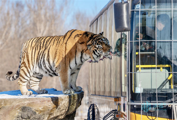 最受瞩目的当属惊险车游览区,橙黄色的观光车缓缓驶入虎群栖息地。粗壮的枯木旁,几只东北虎身形健硕、威风凛凛,时而慵懒休憩,时而探头靠近车窗,尽显王者风范。当投喂环节开启,老虎们瞬间展露霸气本色,纵身跃起捕食的瞬间,动作迅猛有力,引得车内游客阵阵惊叹,大家纷纷举起手机记录这震撼画面。