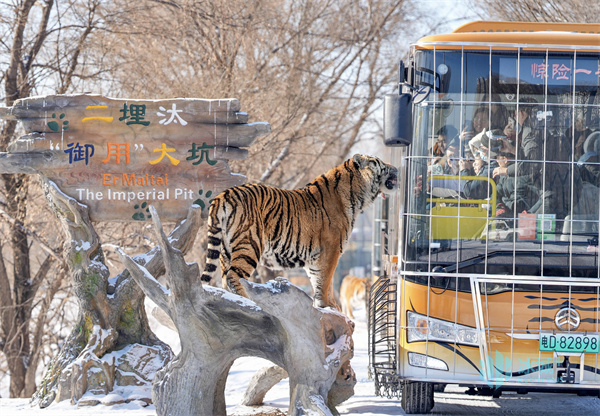 2月18日,农历丙午马年大年初二,黑龙江东北虎林园迎来春节客流高峰,园区内人头攒动,等待乘坐惊险观光车的游客井然有序排起了蛇形长队,八方游客齐聚冰雪天地,近距离邂逅东北虎的虎虎生威,感受别样新春年味。