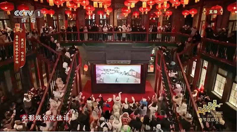 2026年央视总台春晚哈尔滨分会场的聚光灯,照亮了中华巴洛克历史文化街区。坐落于街区南三道街27号的松光里书店内院清水砖墙、雕花围檐和龙江皮影戏非遗项目一起亮相于亿万观众面前。松光里书店的线上IP“冰姐扒书”,大年初一一早便开始陆续推出“春晚文化解读”“春晚十二花神”“我爱哈尔滨”等春晚解读视频作品。冰姐在“春晚文化解读”视频中将书店亮相春晚作为彩蛋,兴奋地向粉丝展示书店内院与春晚镜头,脸上满是骄傲与自豪。