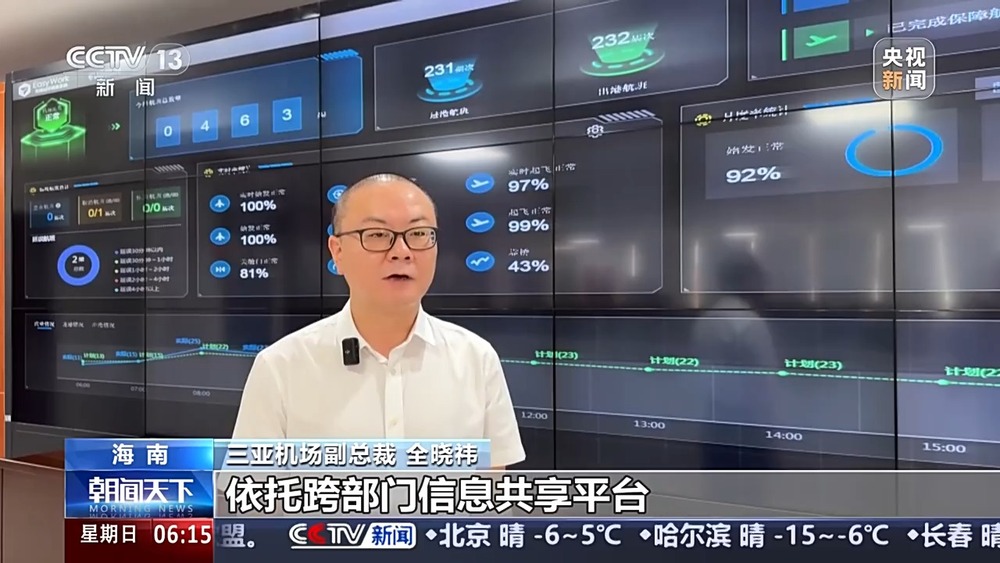 三亚机场副总裁 全晓祎:依托跨部门信息共享平台,各保障单位可提前获取返程旅客预判数据,实现保障资源的精准匹配与弹性部署。航班放行正常率突破92.3%,单日最高保障宽体机138架次。