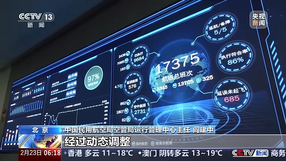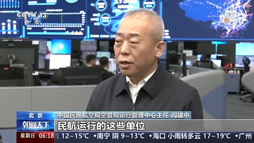 中国民用航空局空管局运行管理中心主任 阎建中:大概每天有10万多个时间节点。一旦有哪个环节受到影响,经过动态调整,会随时给一个新的解决方案,保证其他的航班都不受影响,最大提高运输效率。