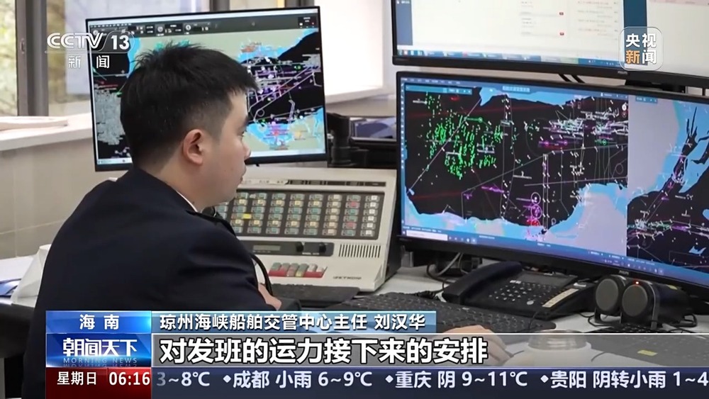 琼州海峡船舶交管中心主任 刘汉华:实时发班的班次达到饱和度70%的时候就会发出预警,我们及时会跟企业进行会商,对发班的运力接下来的安排会做重点的部署。海事监管部门会对客滚航线进行重点关注,特别是对交叉航行船舶的速度,还有航行的情况进行实时监测与安排。