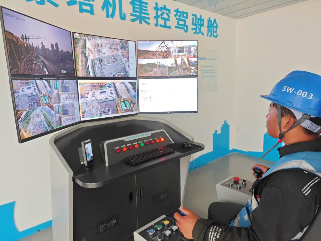 图为工作人员演示“远程驾驶智能集控数字塔机”的操作过程。(受访者供图)
