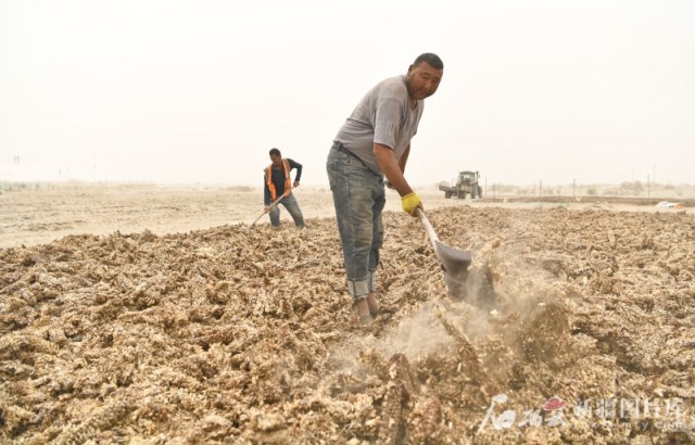 6月13日,沙雅县盖孜库木乡建设防沙治沙综合示范区,工人在晾晒肉苁蓉种子。