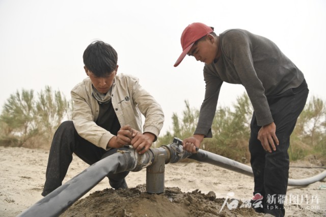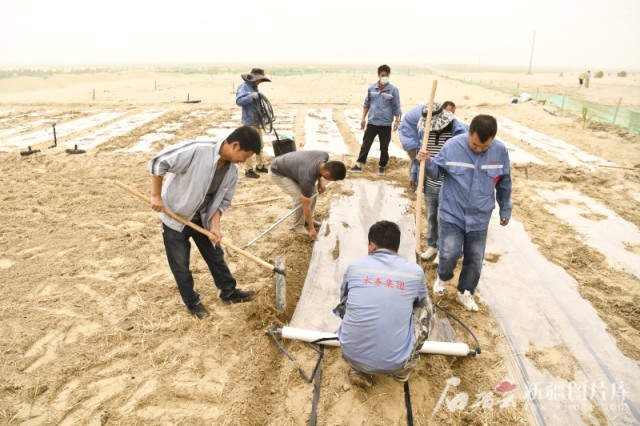 6月13日,沙雅县盖孜库木乡建设防沙治沙综合示范区,工人在用滴灌带给梭梭输水。