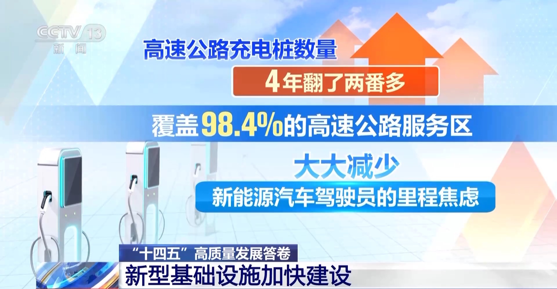 高速公路充电桩数量4年翻了两番多,覆盖了98.4%的高速公路服务区,大大减少了新能源汽车驾驶员的里程焦虑。