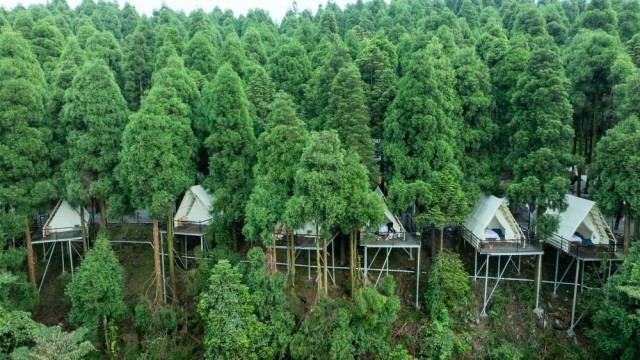 位于重庆东部的石柱土家族自治县,七曜山脉穿插而过。这里有一条山脊背上的公路,因为雄奇险峻,被不少网友称为“刀片天路”,成为不少骑行爱好者和摄影爱好者打卡的热门选择。于是,当地借势打造了森林露营基地。