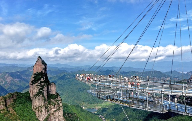 7月5日,游客在浙江省台州市仙居县神仙居景区南天顶玻璃观景台上游玩(无人机照片)。