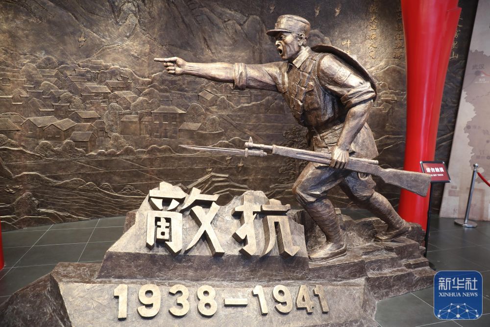 ↑ 安徽泾县的新四军军部旧址陈列馆中的《抗敌》雕塑(7月14日摄)。