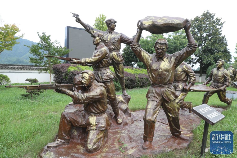 ↑ 安徽泾县的新四军军部旧址陈列馆院内的《军民齐上阵》雕塑(7月14日摄)。