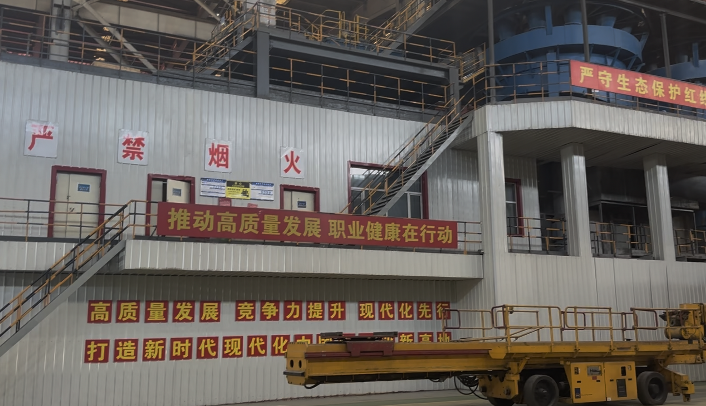 赵春波所说的安全通道,就是在车间内划定的一条绿色区域,在车间一层这条通道有大约两米宽,比较宽敞,但在浮选槽顶部的参观通道宽度不足一米,在不侧身的情况下仅能容纳一人通行,通道一侧是护栏,另一侧是没有铺设绿色垫子的其他格栅板。