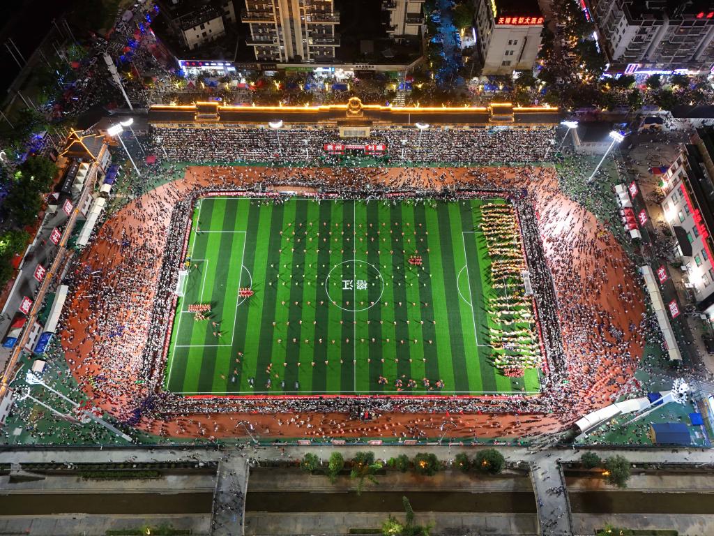 7月26日,大量观众来到榕江“村超”球场(无人机照片)。新华社记者 刘续 摄