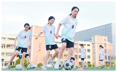 江西宜春上高县锦阳小学托管班上,学生在踢足球。陈旗海摄(人民视觉)