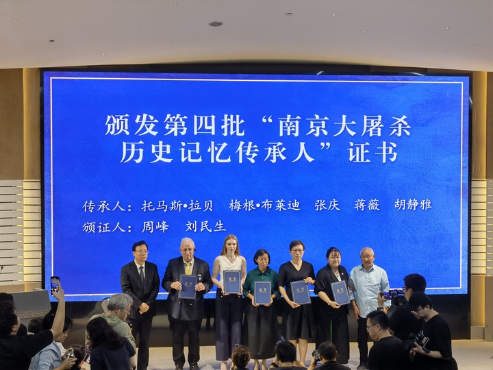 新华社南京8月15日电(记者蒋芳、邱冰清)第四批南京大屠杀历史记忆传承人颁证仪式15日在侵华日军南京大屠杀遇难同胞纪念馆举行。6名南京大屠杀历史记忆传承人获得认证,其中包括两名国际友好人士。