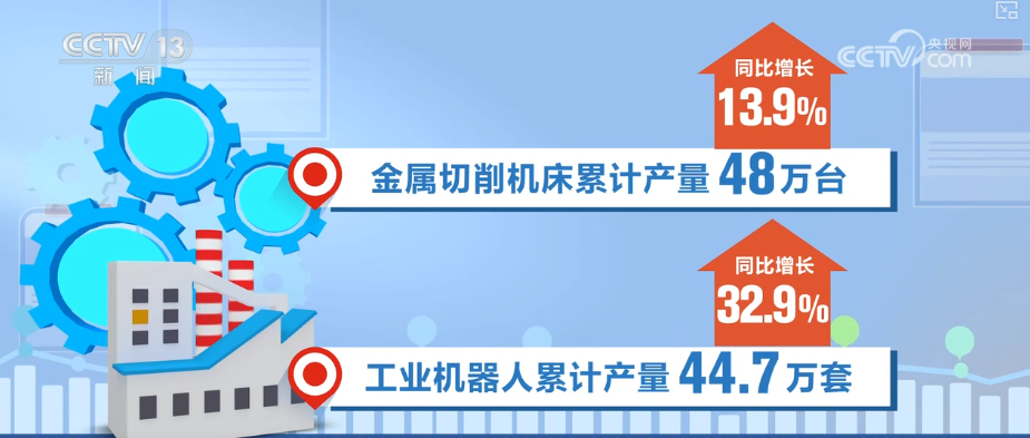 在机械工业代表性产品中,金属切削机床累计产量为48万台,同比增长13.9%;工业机器人累计产量为44.7万套,同比增长32.9%,推动新质生产力加快培育。