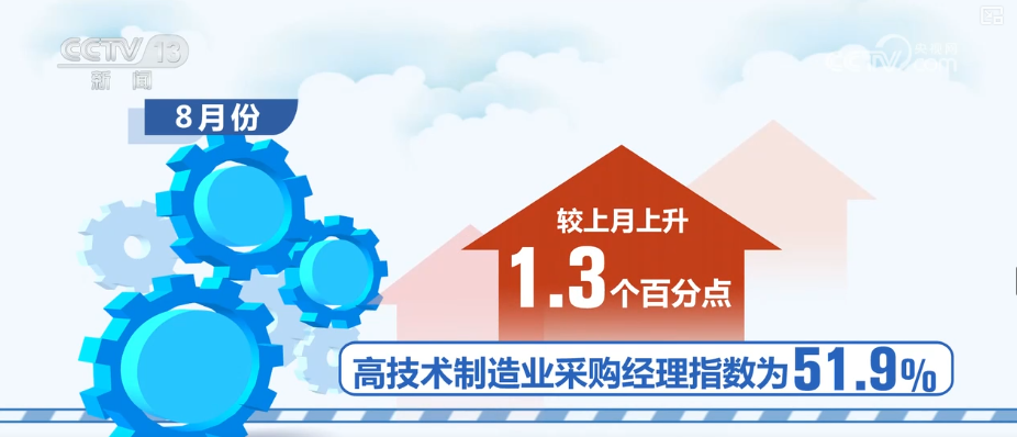 新动能加快扩张,支撑引领作用持续增强。8月份,装备制造业采购经理指数为50.5%,较上月上升0.2个百分点;高技术制造业采购经理指数为51.9%,较上月上升1.3个百分点。其中,生产指数和新订单指数都上升至54%左右的较好水平。