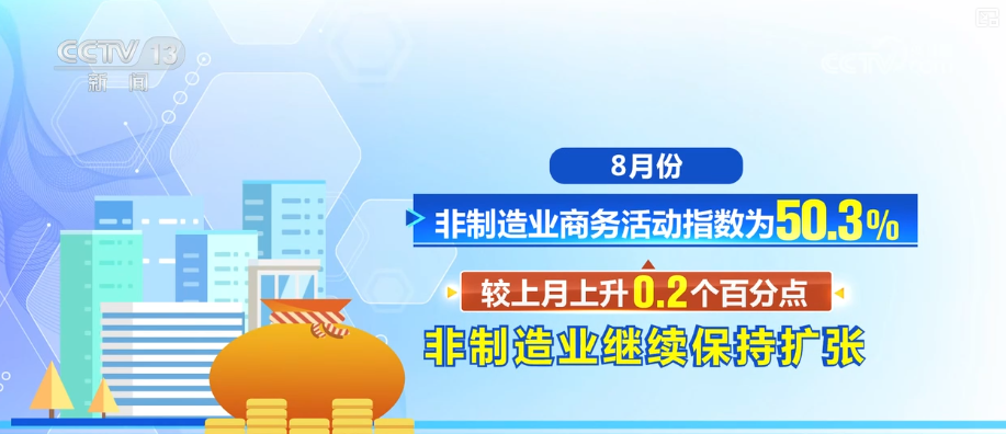 8月份,非制造业商务活动指数为50.3%,较上月上升0.2个百分点,非制造业继续保持扩张。其中,服务业商务活动指数为50.5%,较上月上升0.5个百分点,升至年内高点。