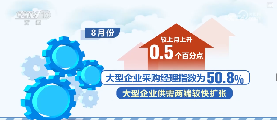 从企业类型看,大型企业延续稳定扩张态势。8月份,大型企业采购经理指数为50.8%,较上月上升0.5个百分点。大型企业供需两端较快扩张,较好稳住制造业基本盘。