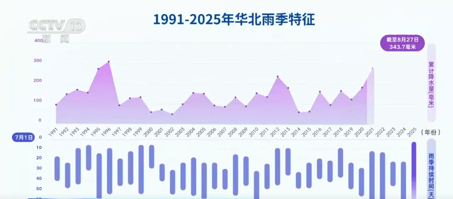 记者从中国气象局国家气候中心了解到,今年,我国的华北雨季已于9月2日正式结束,其持续时间和累计雨量均创下历史新高,成为自1961年以来最强雨季。