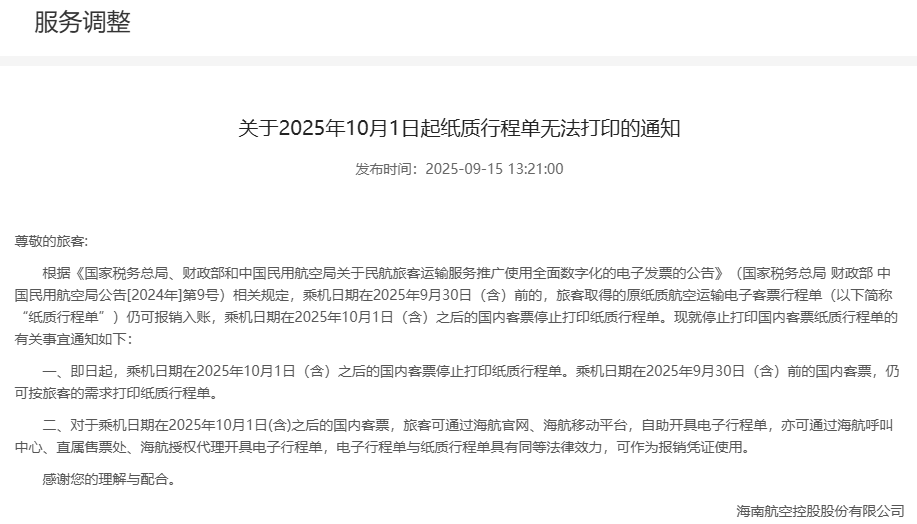 9月15日,海南航空官网发布了《关于2025年10月1日起纸质行程单无法打印的通知》。