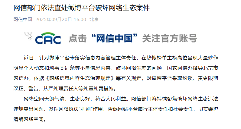 近日,针对微博平台未落实信息内容管理主体责任,在热搜榜单主榜高位呈现大量炒作明星个人动态和琐事类词条等不良信息内容,破坏网络生态的问题,国家网信办指导北京市网信办,依据《网络信息内容生态治理规定》等有关规定,对微博平台采取约谈、责令限期改正、警告、从严处理责任人等处置处罚措施。