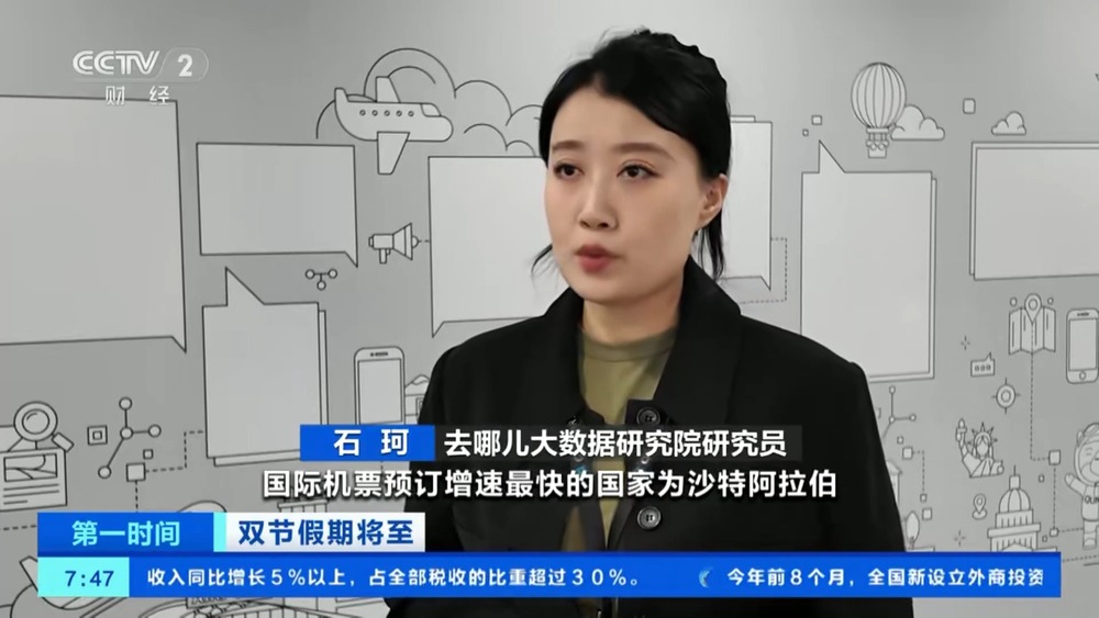 去哪儿大数据研究院研究员 石珂:与去年国庆相比,国际机票预订增速最快的国家为沙特阿拉伯,比利时、希腊、老挝、斯里兰卡和哈萨克斯坦的机票预订增幅均超过一倍。免签政策利好带动上合组织国家的机票预订量走高,中国旅客前往乌兹别克斯坦的机票预订量增长3.3倍,哈萨克斯坦增长了2.3倍。