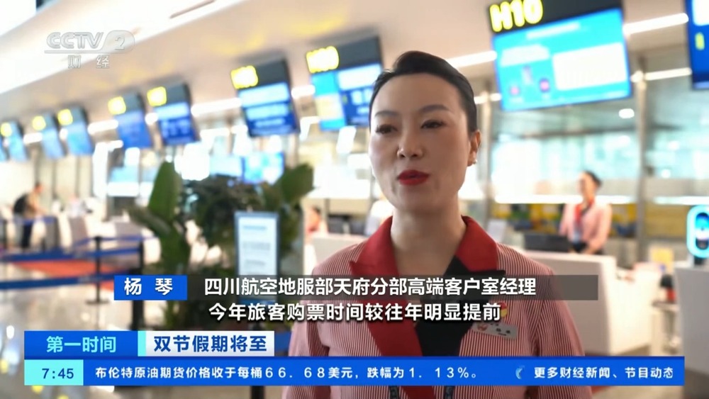 四川航空地服部天府分部高端客户室经理 杨琴:预售情况来看,今年旅客购票时间较往年明显提前,9月30日和10月1日为节前出行的高峰。成都飞往北京、深圳、杭州等地的部分航班客座率已经达到了80%,敦煌、阿勒泰等西北航点机票已经基本售罄。