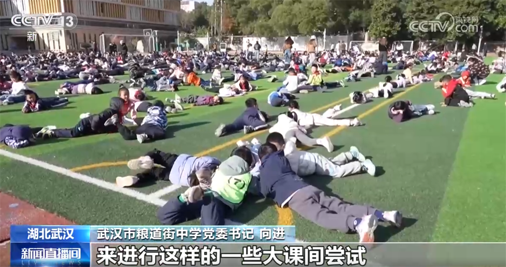 上午九点,阳光洒满校园。在粮道街中学积玉桥校区的操场上,上千名学生整齐躺下,开启了一场别开生面的“日光浴”。有的孩子伸展四肢,有的快活翻滚,这样的大课间成了孩子们期待的“充电时刻”。