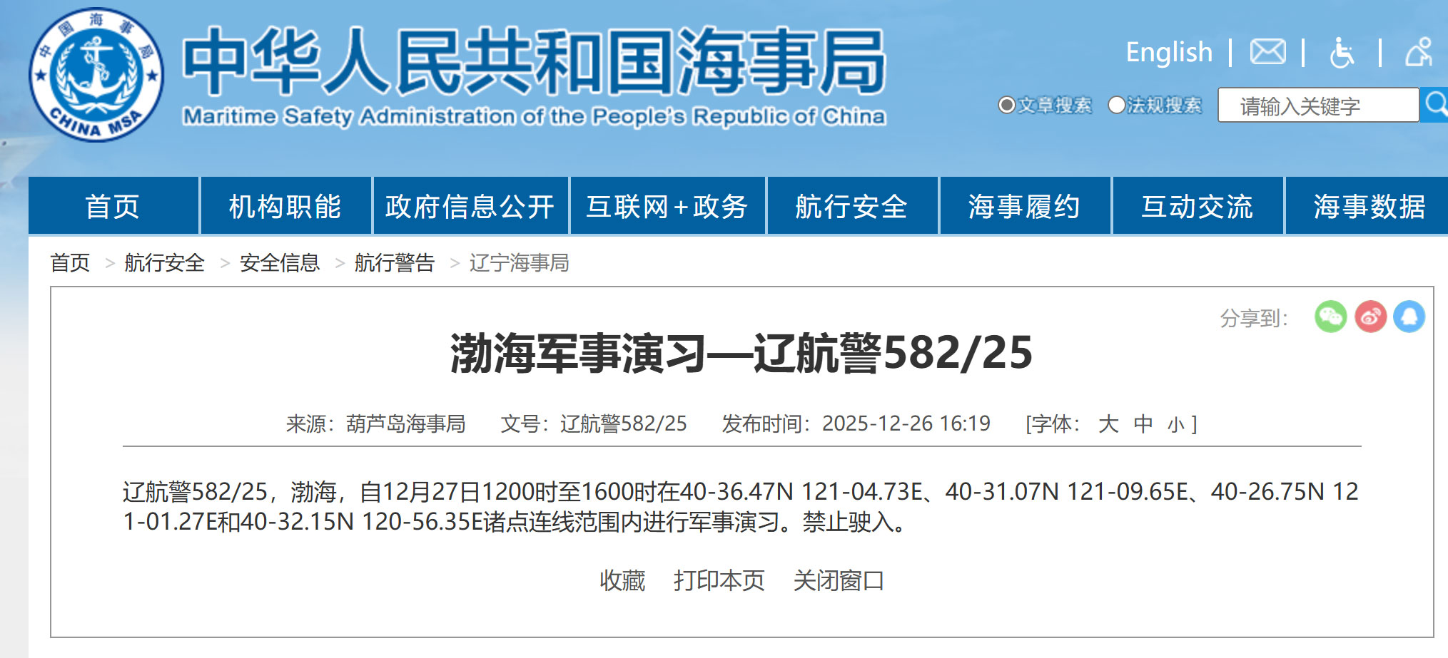 央视网消息:据中国海事局网站消息,葫芦岛海事局发布航行警告,12月27日12时至16时,渤海部分海域进行军事演习,禁止驶入。