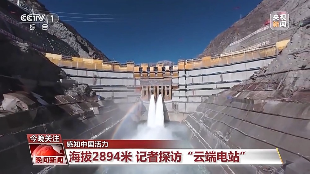 总台央视记者古峻岭在海拔2894米的叶巴滩水电站坝顶介绍,随着首批机组投产,叶巴滩成为金沙江上游已投产的最大水电站。站在坝顶望去,两条白色水柱如同巨龙,正从大坝中间的泄流孔道喷涌而出,阳光照射在水雾之上,一道斑斓的彩虹随之浮现。这座建设历时近10年的水电站,于27日发出了第一度绿电。